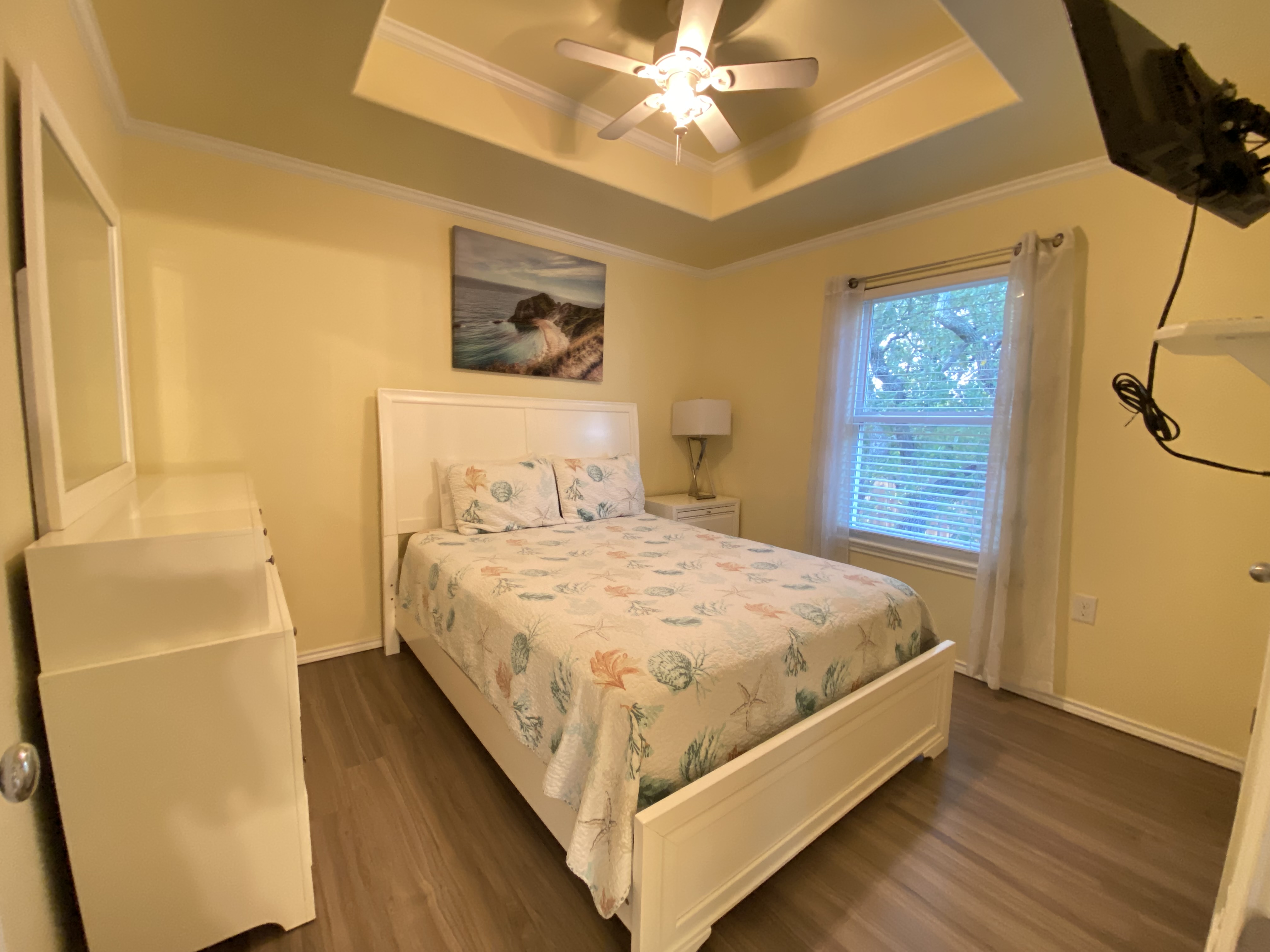 🛏 One inviting bedroom, featuring a plush queen bed and a comfortable sofa bed, providing plenty of sleeping space for family and friends.
