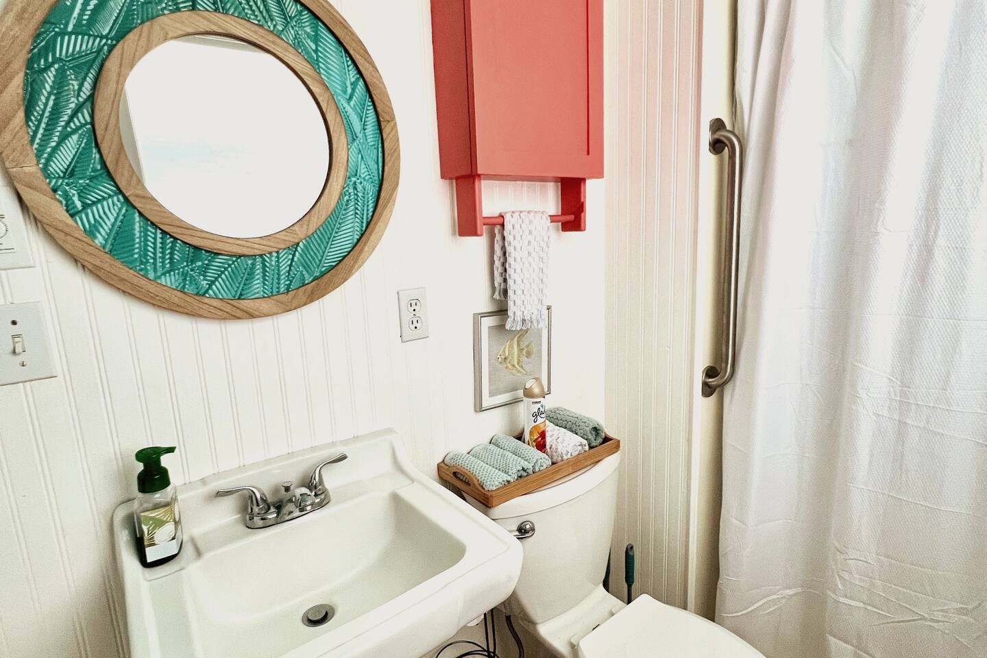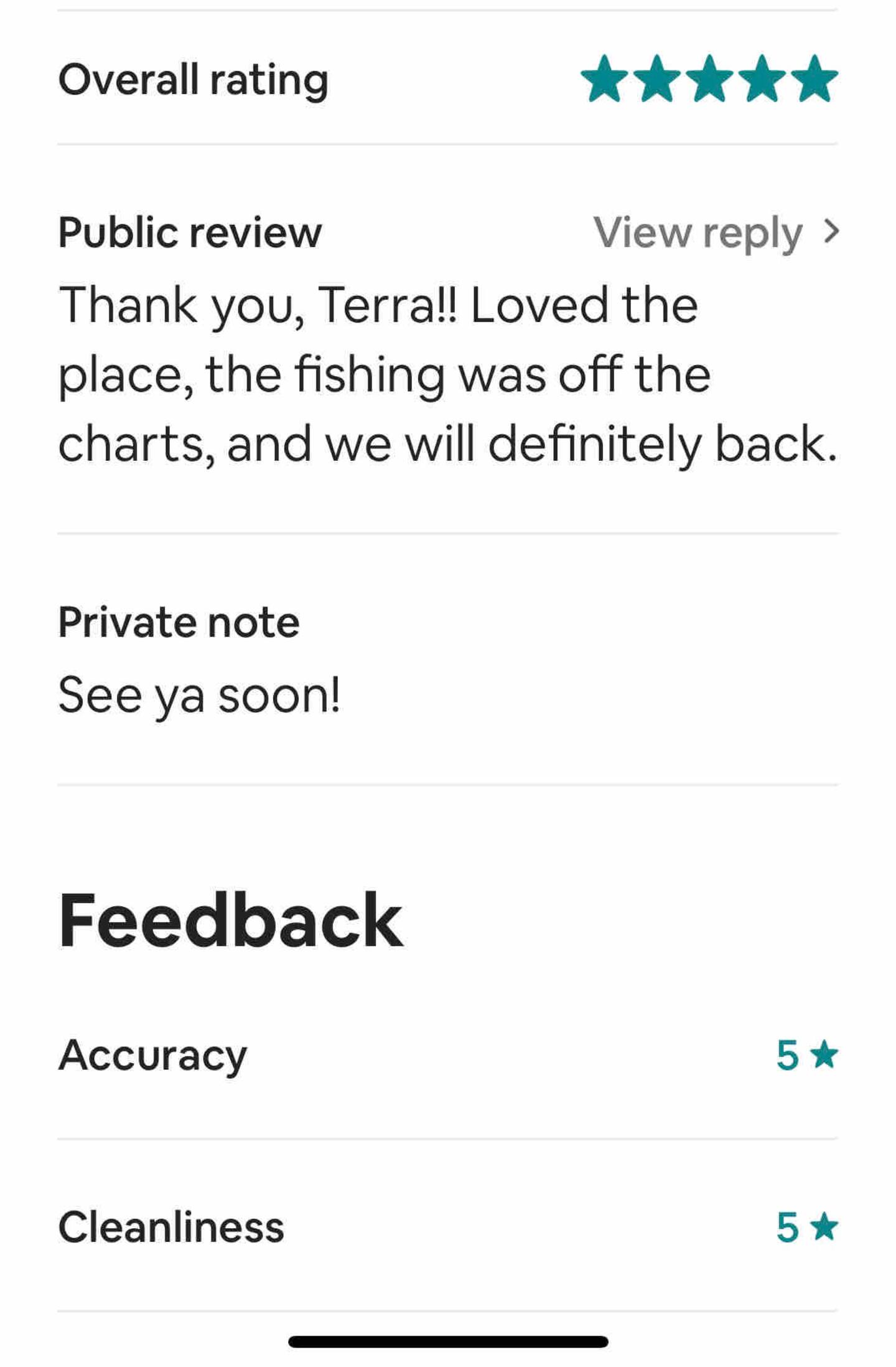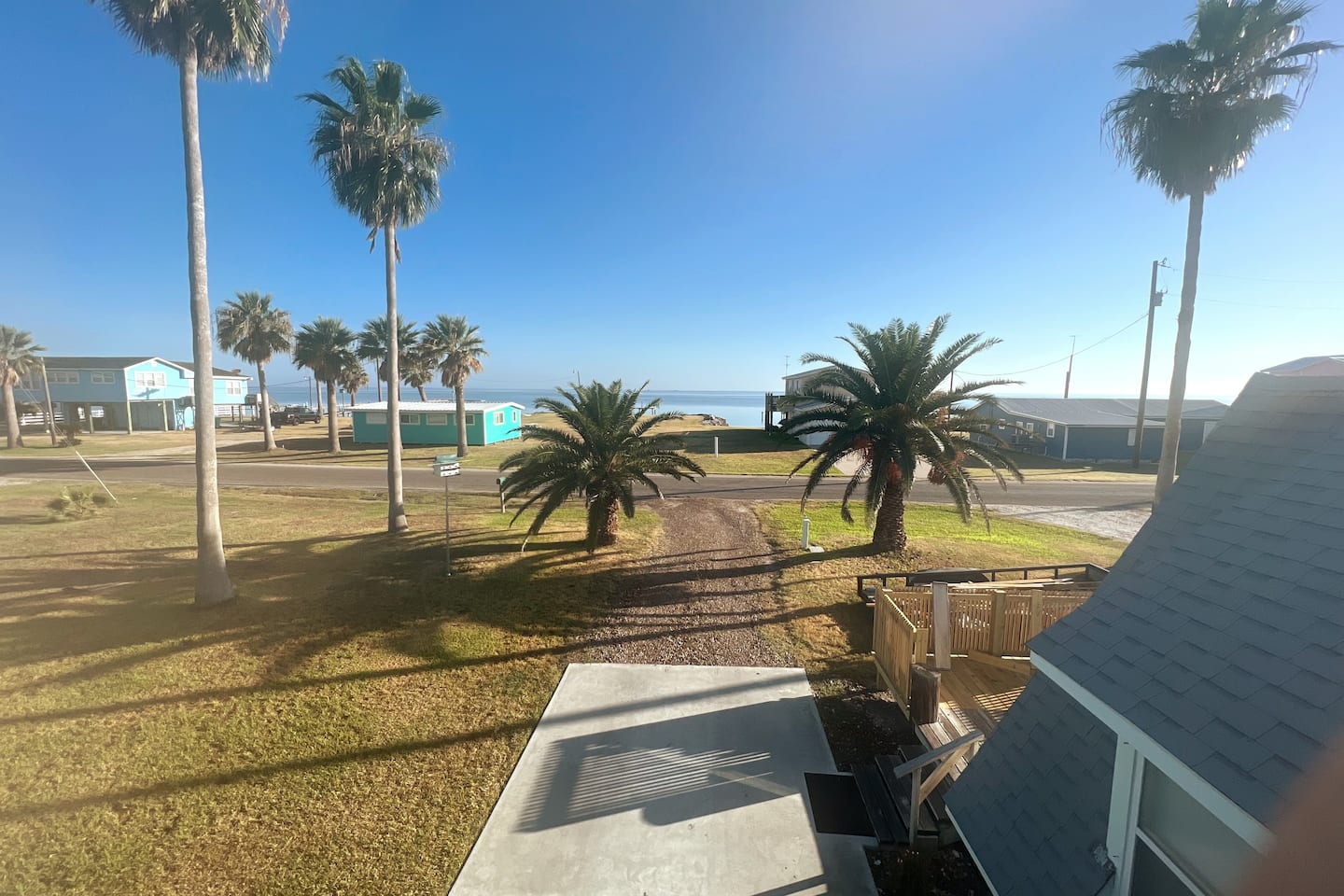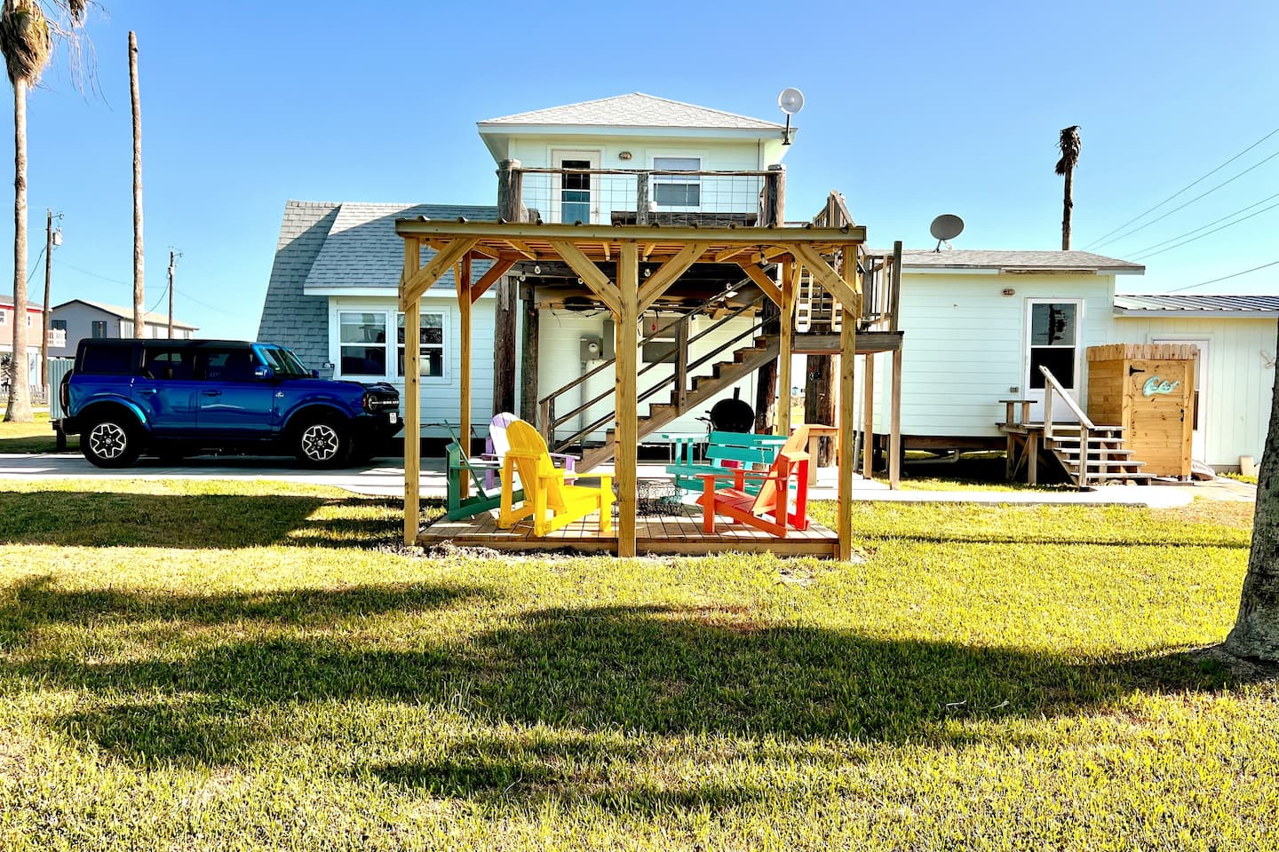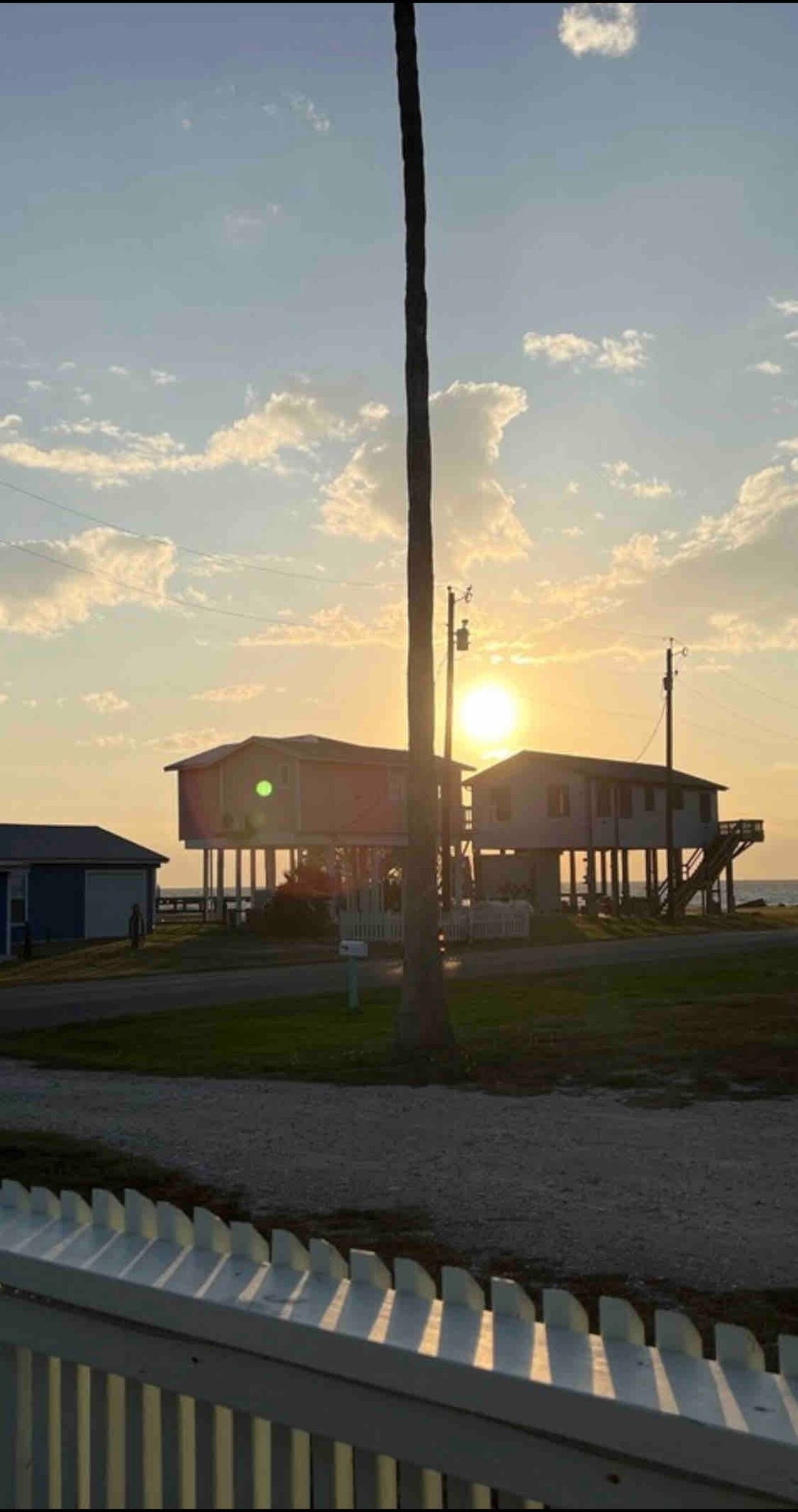 Beautiful sunrises and sunsets! We are set-up -up to allow for the most privacy while giving ample opportunity to spend time together on three different patios/ decks--1 deck off the front porch. The next deck is beside the driveway, shaded by the pergola. You will also have seating on the upstairs deck for the couple lucky enough to call dibs on the king bedroom. We have a picnic table under the elevated deck, which always seems to catch a great breeze--perfect spot for hanging out and eating up fresh-caught fish.