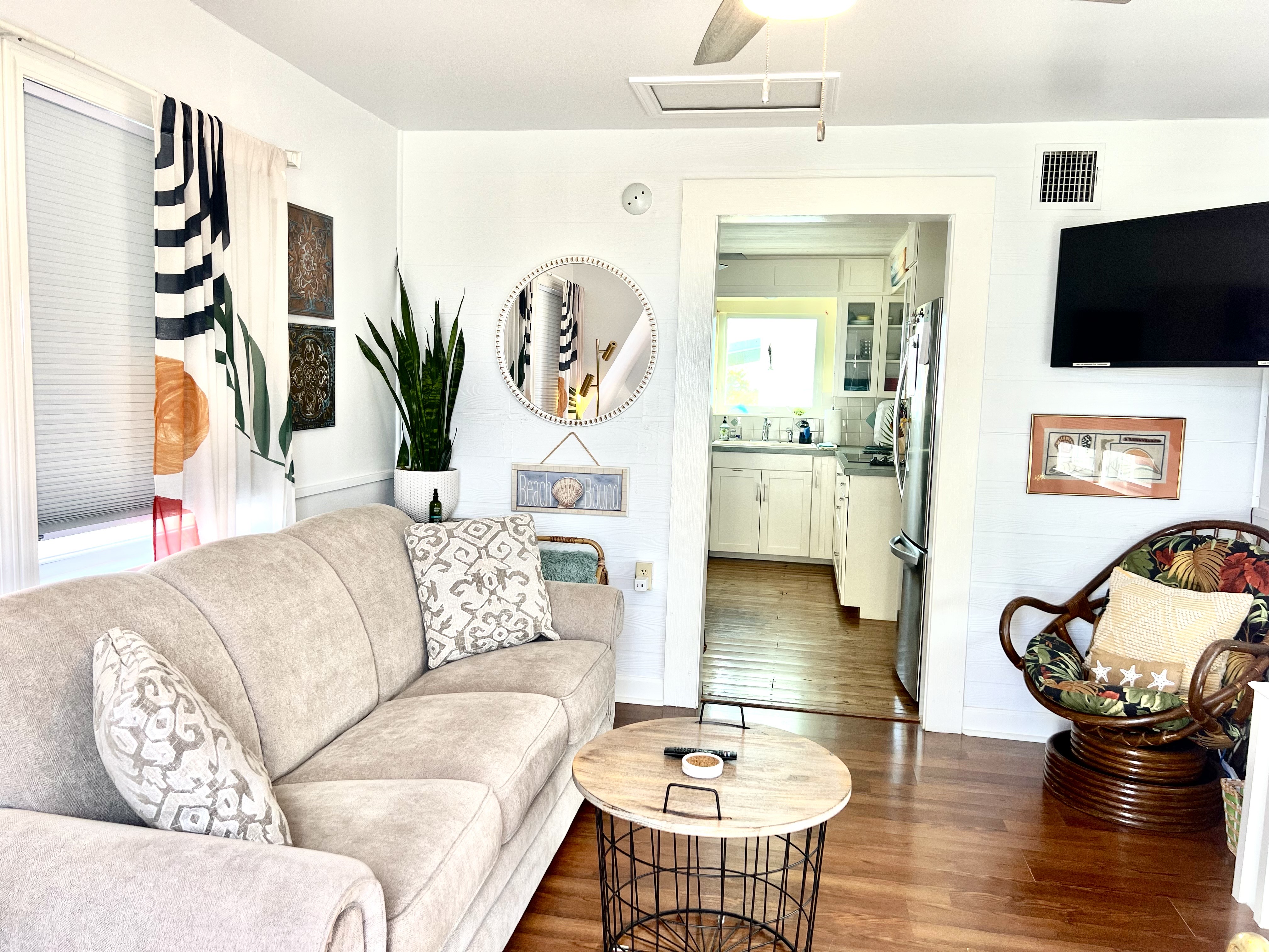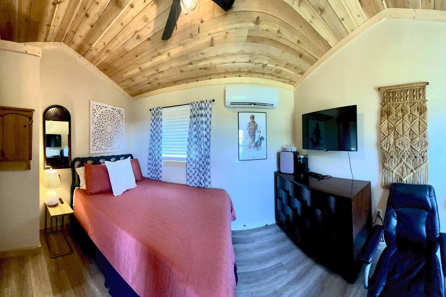The second bedroom is located in the building just behind the main house. This room offers queen size bed, 43" Smart TV single and serve-Keurig. This room also has a 1/2 bath with outdoor shower with hot and cold water just outside the door at ground-level.