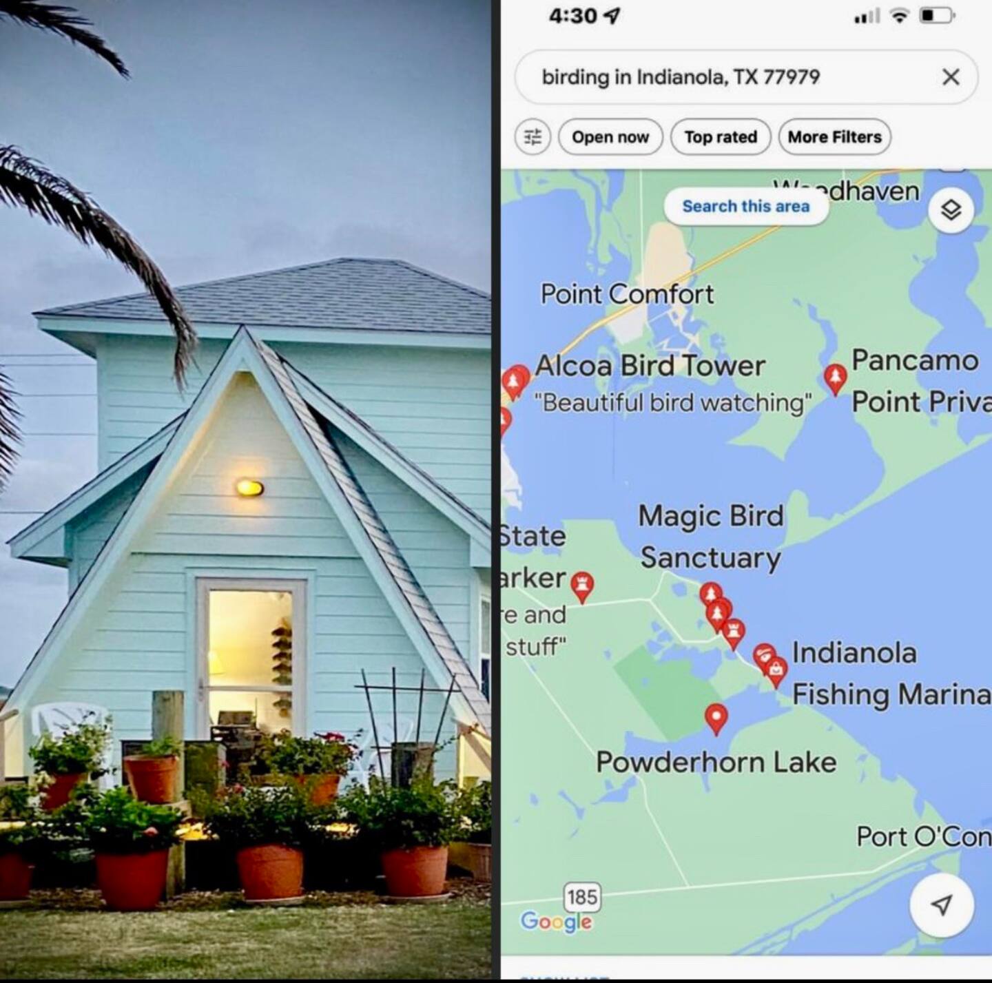 Breathtaking 360-degree water views await at our A-frame in historic Indianola. We are just one minute from Indianola Fishing Marina and we have plenty of space to park your boat. The fishing is amazing--whether you're in a boat or on a pier. Catch a great coastal breeze and stellar sunsets and sunrises are unmatched.