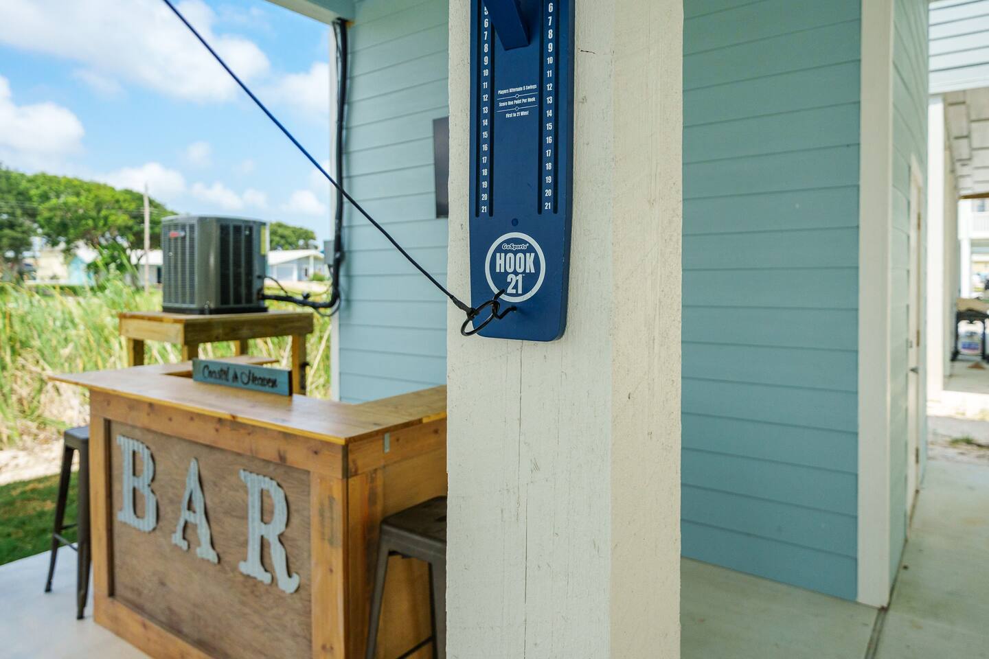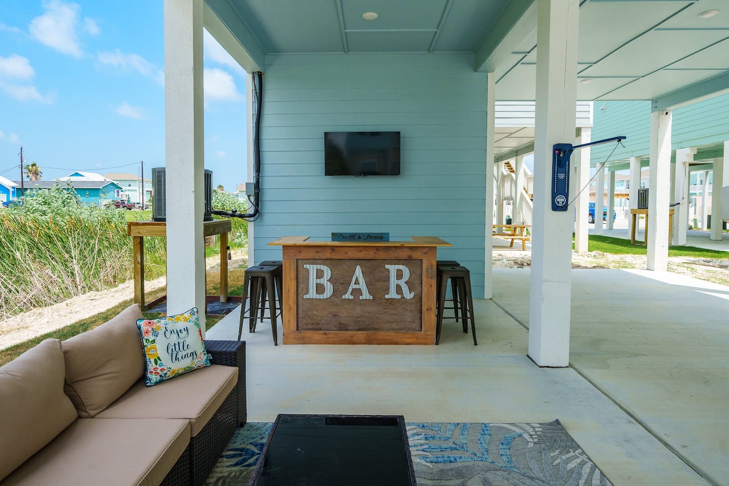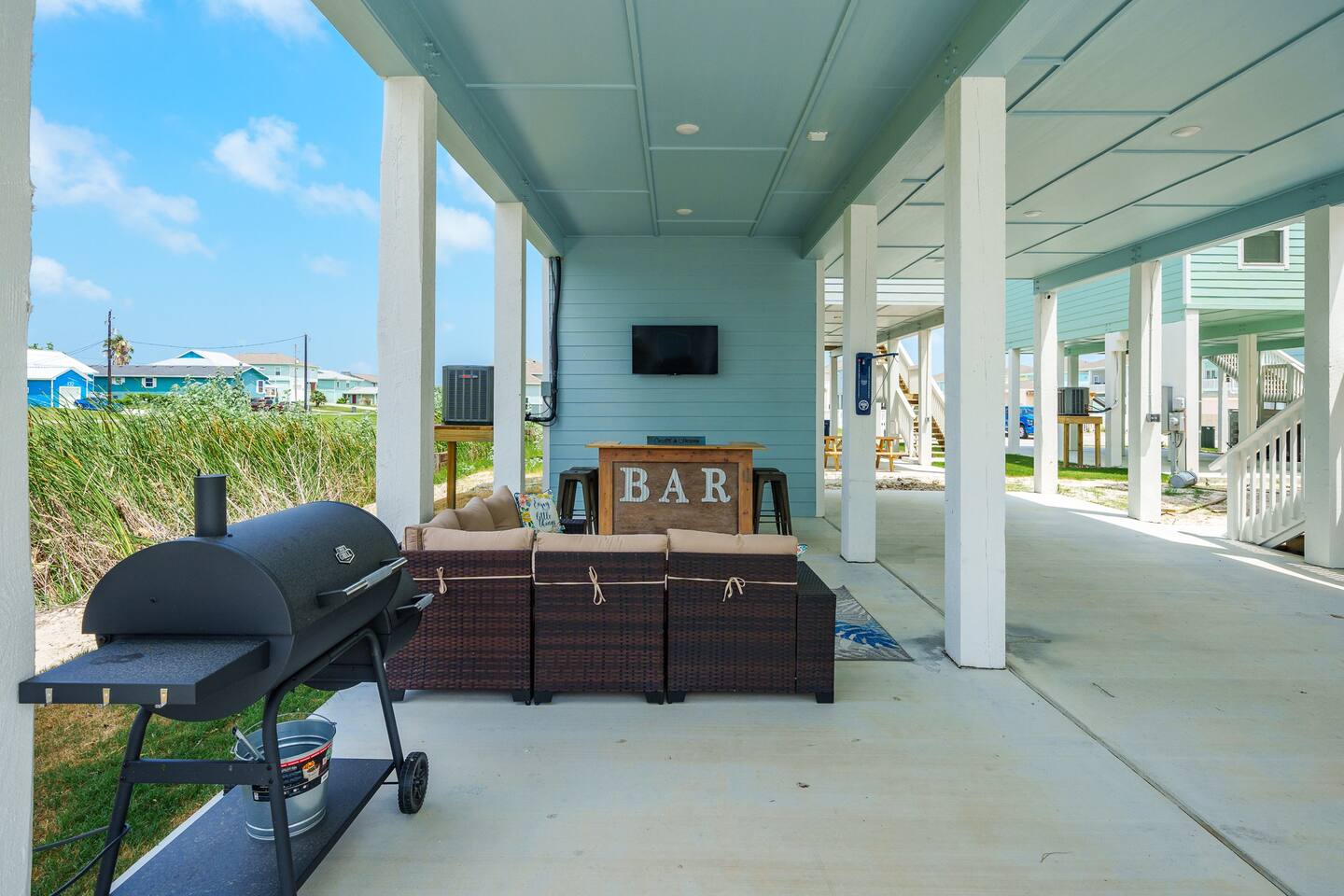 There is outdoor entertainment available downstairs, which includes comfortable patio seating, a television placed over the outdoor bar, and stools for people to sit on. The Com