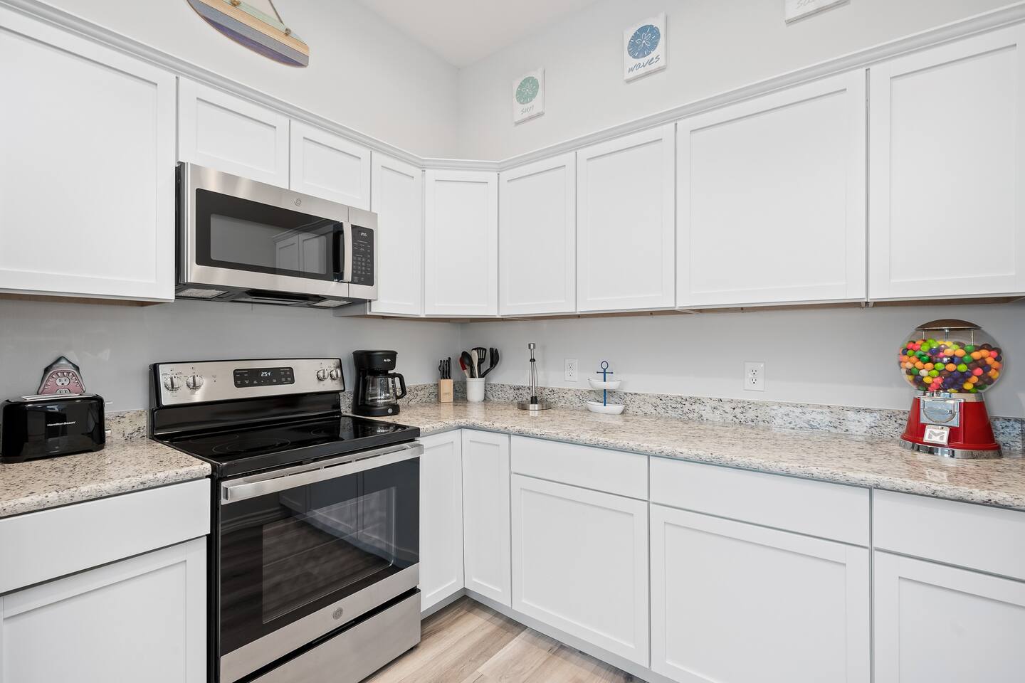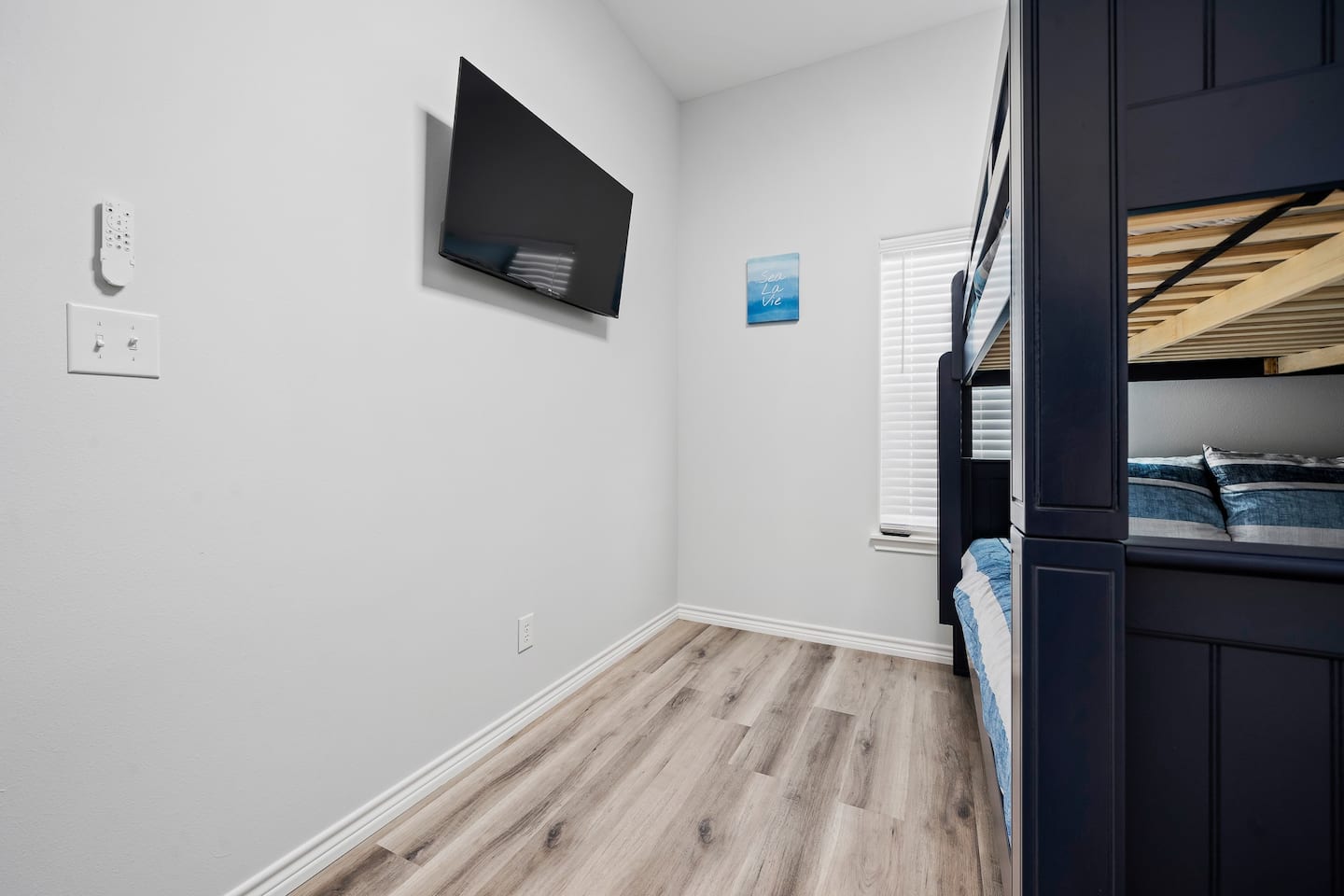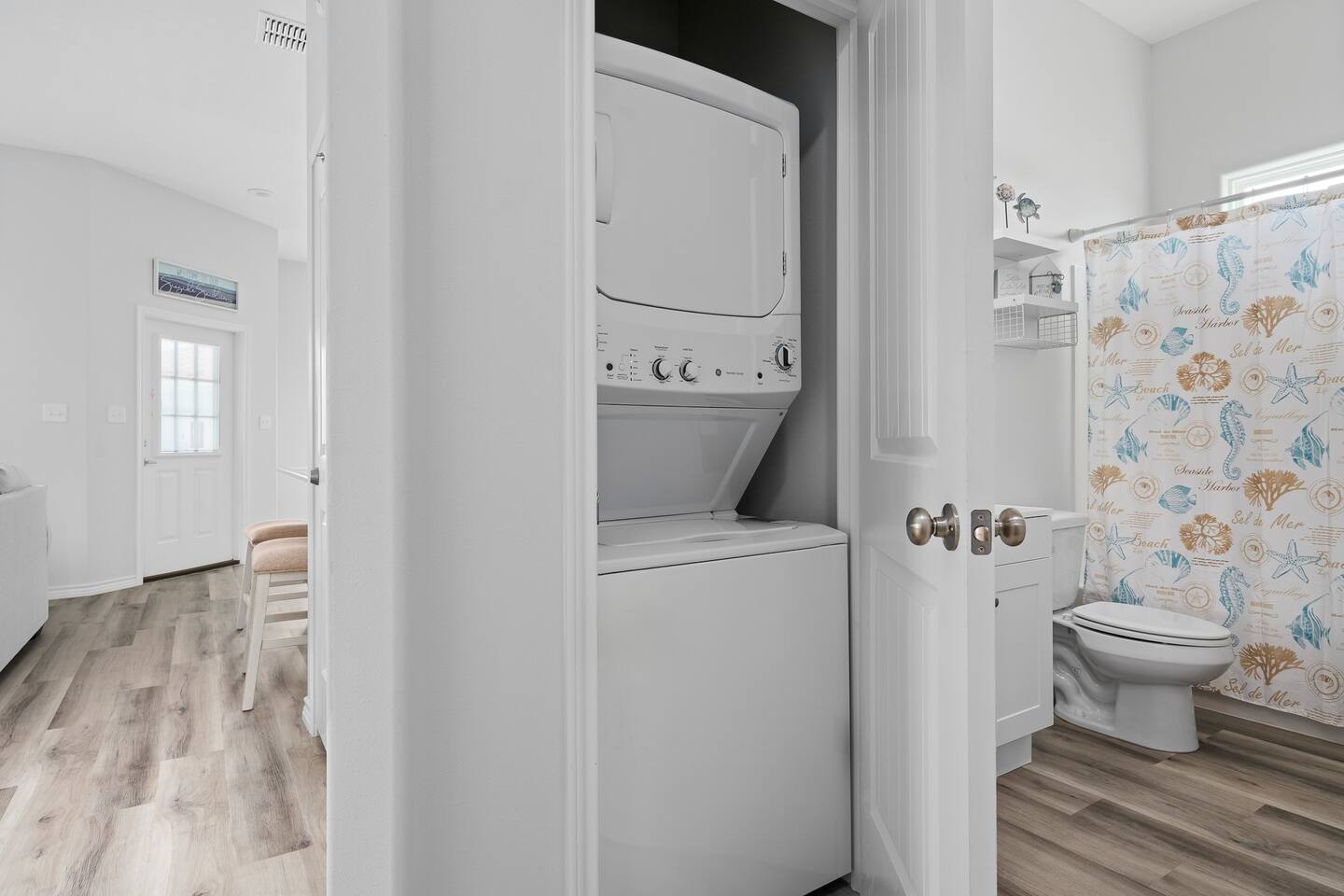Our primary bedroom features a comfortable queen bed and an ensuite bathroom with a tub-shower combo. You can also enjoy streaming your favorite shows on the smart TV in the room. The second bedroom is perfect for kids or extra guests, with a queen-over-queen bunkbed (can fit adults and hold up to 1200 pounds) and its own smart TV for streaming. Second bathroom has a tub shower combo as well. If you need additional sleeping space, the living room has a queen sofa sleeper with a 2-inch topper for added comfort. And if that's not enough, we have a queen air mattress available as well. We want to make sure all of our guests have a comfortable stay! Stackable washer and dryer for any laundry needs.
