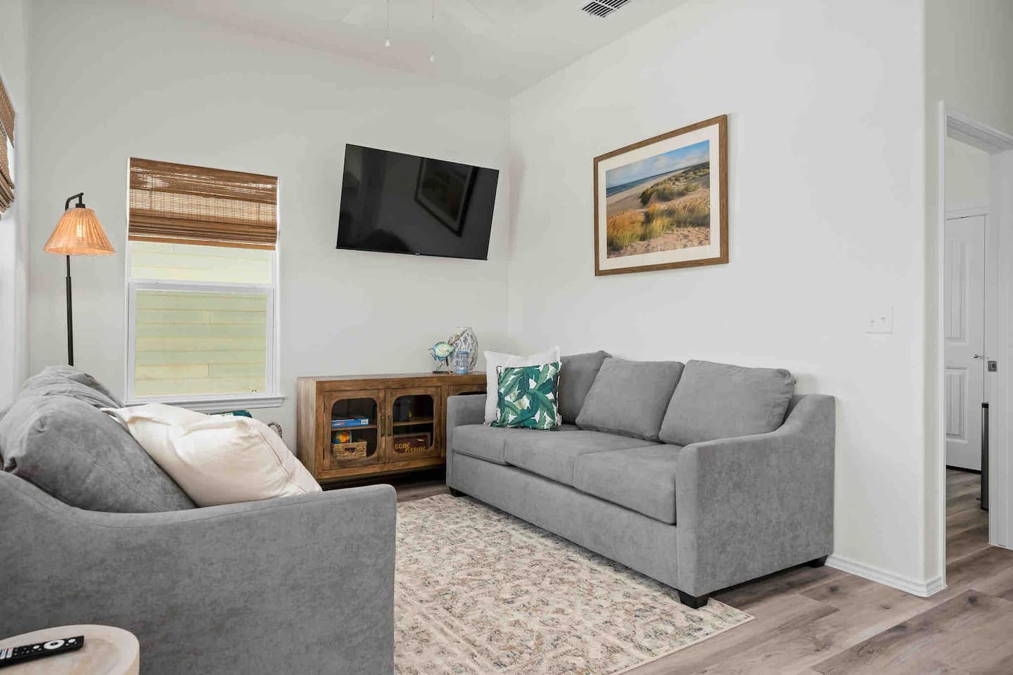 Inside, enjoy an open-concept living area with cozy seating, including a queen-size sleeper sofa—ideal for lounging after a day on the coast. The fully equipped kitchen features modern appliances and all the essentials for cooking, dining, and entertaining with ease. A full-size washer and dryer make extended stays and sandy clothes a breeze.
