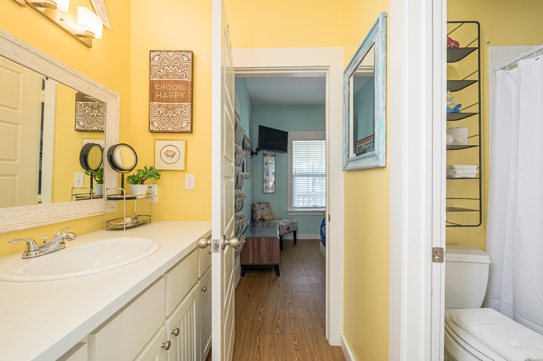 The bathroom is a classic Jack and Jill with locking doors from each end. The toilet and shower are separate from the vanity area so more than one person can get ready.